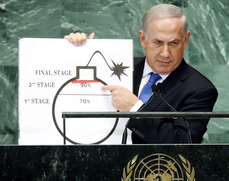 Benjamin Netanyahu has a stunning record of being wrong about Iranian nuclear capabilities. In 2002, he testified before Congress: ” There is no question whatsoever that Saddam is seeking, is working, is advancing towards the development of nuclear weapons.” He was wrong. In 1992, Netanyahu claimed Iran was “3-5” years from a nuclear weapon. He was wrong. For the last 30 years, Netanyahu and the Israeli government have cried wolf—and they have been wrong every. single. time. This record of lying indicates that the Israeli government is paranoid, exaggerating, or even misreading intelligence. You should be incredibly skeptical that this time, the wolf is here.